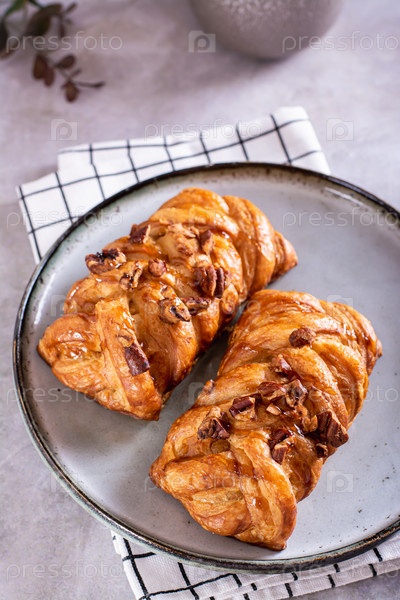 Шведское время фика с крупным планом булочек с корицей, орехов и кленового сиропа на столе, вертикальный вид
