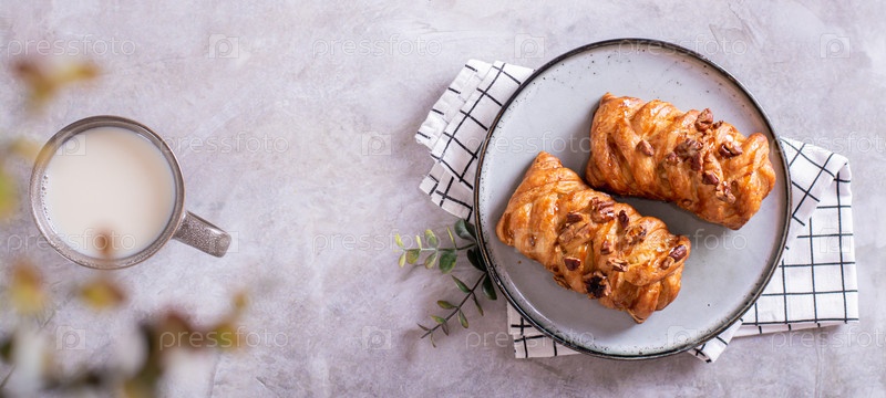 Шведское время фика со свежими булочками с корицей и чашкой латте на веб-баннере с видом на стол