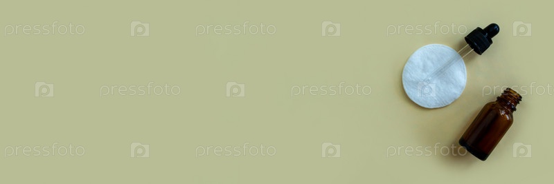 Баннер. Плоская бутылка с пипеткой и белым ватным диском на бежевом фоне