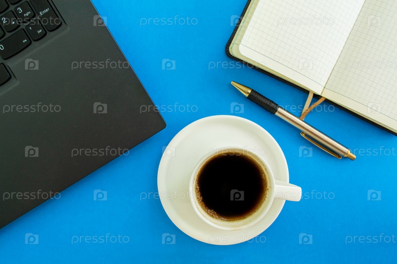 Рабочий стол. Ноутбук, блокнот и ручка, кофейная чашка