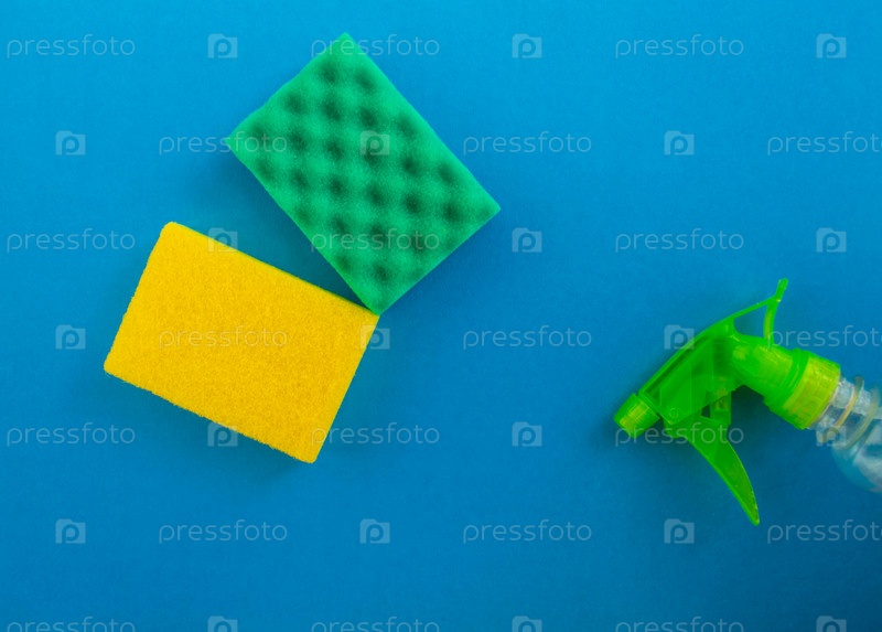 Уборка. Плоские губки и чистящие средства на синем фоне