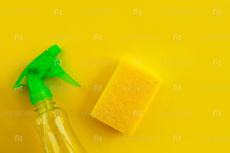 Уборка. Плоская бутылка с чистящим средством и губкой на желтом фоне