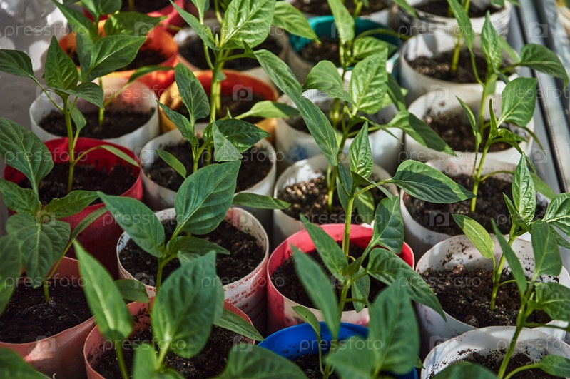 Рассада зеленого перца в маленьких пластиковых стаканчиках, выращенная дома и подготовленная к посадке в грунт