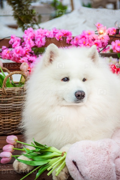 Самоедская собака, белая хаски, забавная пушистая самоедская собака лежит среди весенних цветов
