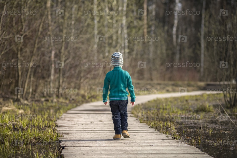 Мальчик идет по тропинке в зеленом парке. Путь представляет собой мост через озеро