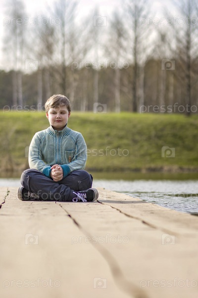 Мальчик сидит на мосту в зеленом парке. Путь представляет собой мост через озеро