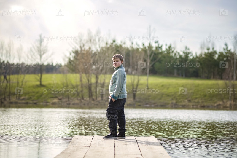 Мальчик идет по тропинке в зеленом парке. Путь представляет собой мост через озеро