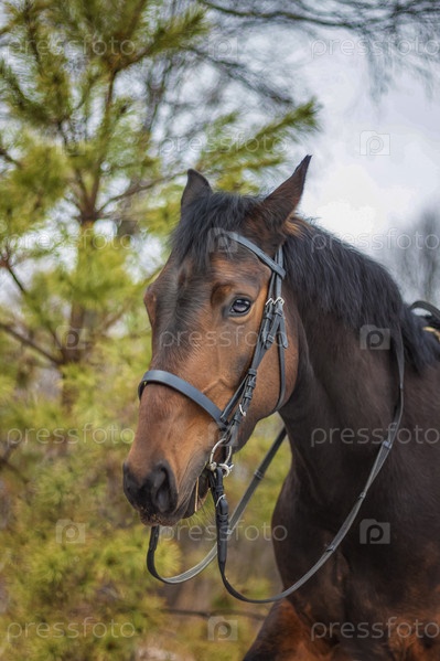 Лошадь стандартной породы темно-бурой масти, четвероногие, используемые для упряжных скачек, порода лошадей для рыси, портрет крупным планом