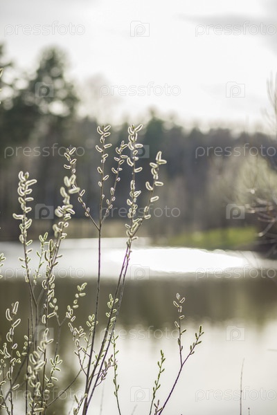 Молодые ветки дерева у воды. весной во время половодья