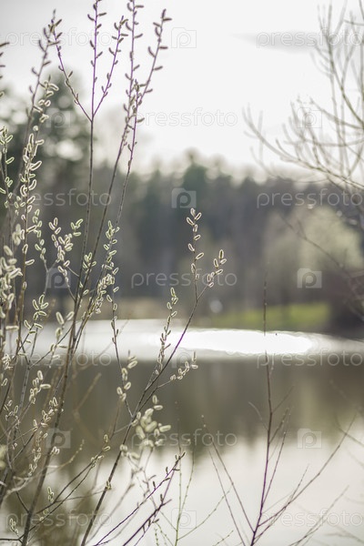 Молодые ветки дерева у воды. весной во время половодья