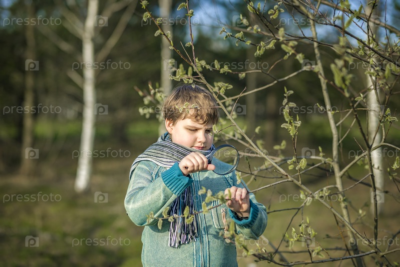 Забавный мальчик гуляет по весеннему парку, рассматривает листья с помощью большой лупы, ищет жуков и наслаждается