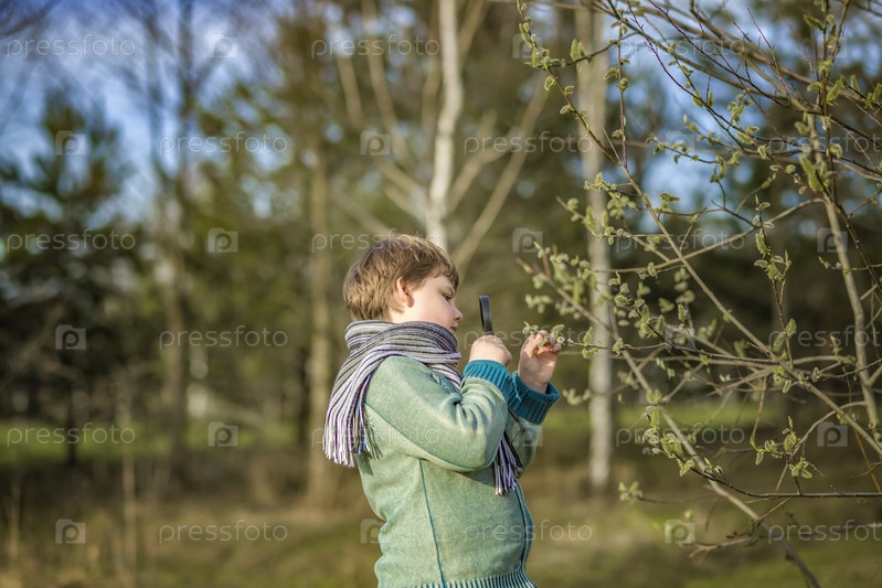 Забавный мальчик гуляет по весеннему парку, рассматривает листья с помощью большой лупы, ищет жуков и наслаждается