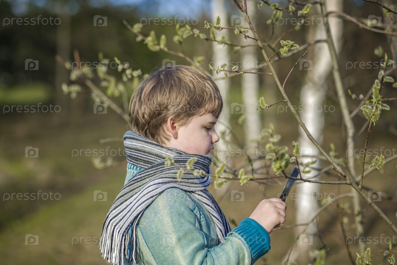 Забавный мальчик гуляет по весеннему парку, рассматривает листья с помощью большой лупы, ищет жуков и наслаждается