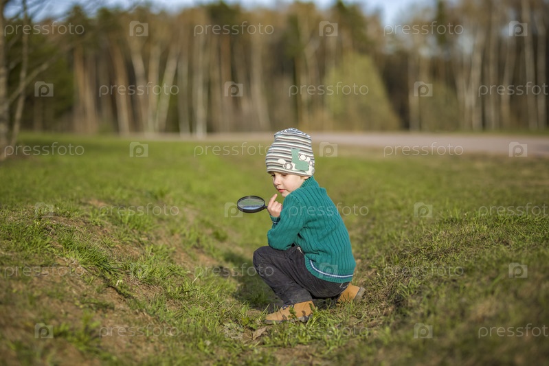Забавный мальчик гуляет по весеннему парку, рассматривает листья с помощью большой лупы, ищет жуков и наслаждается