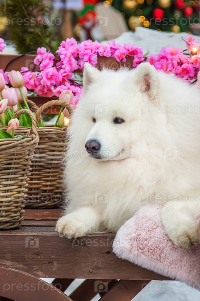 Самоедская собака, белая хаски, забавная пушистая самоедская собака лежит среди весенних цветов