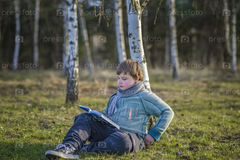 Красивый мальчик в шарфе в весеннем парке, сидит под березой, читает книгу и наслаждается мечтами