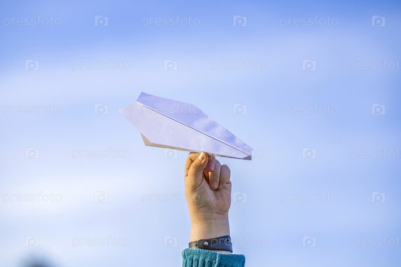 Рука мальчика держит белый бумажный самолетик на фоне неба