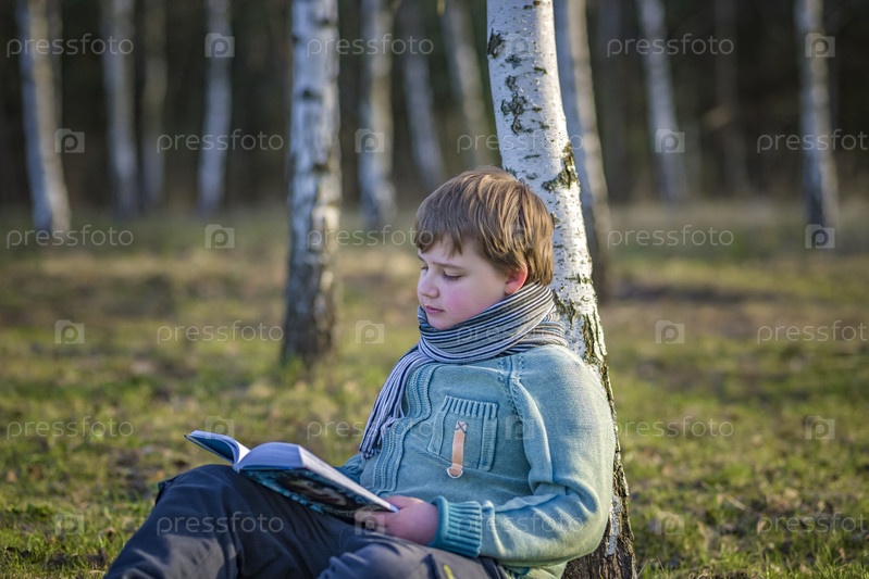 Красивый мальчик в шарфе в весеннем парке, сидит под березой, читает книгу и наслаждается мечтами