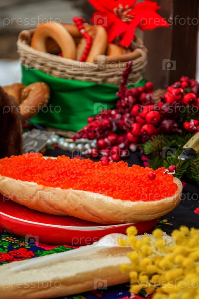 Красную икру намазывают на хлеб толстым слоем. Масленичная уличная ярмарка