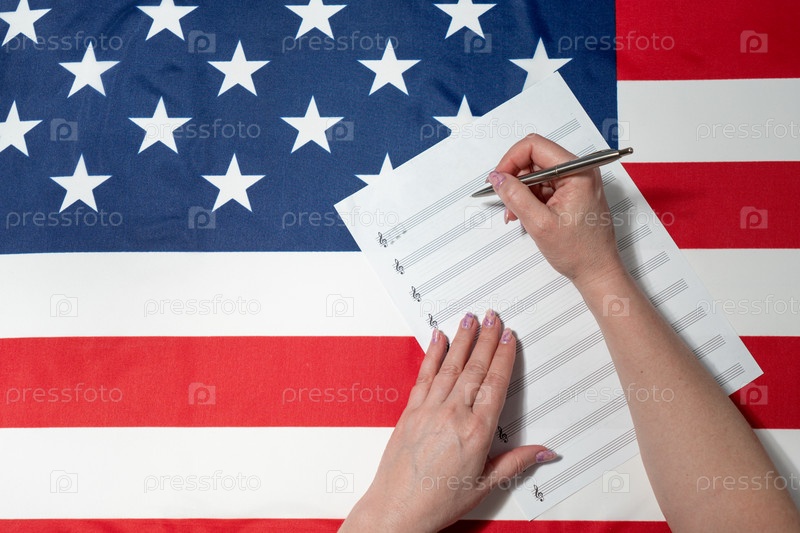 Крупный план женских рук пишущих музыкальные ноты на листе с нотным станом, на фоне американского флага