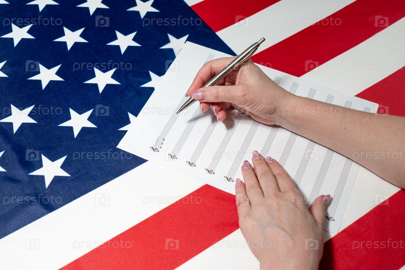 Крупный план женских рук пишущих музыкальные ноты на листе с нотным станом, на фоне американского флага