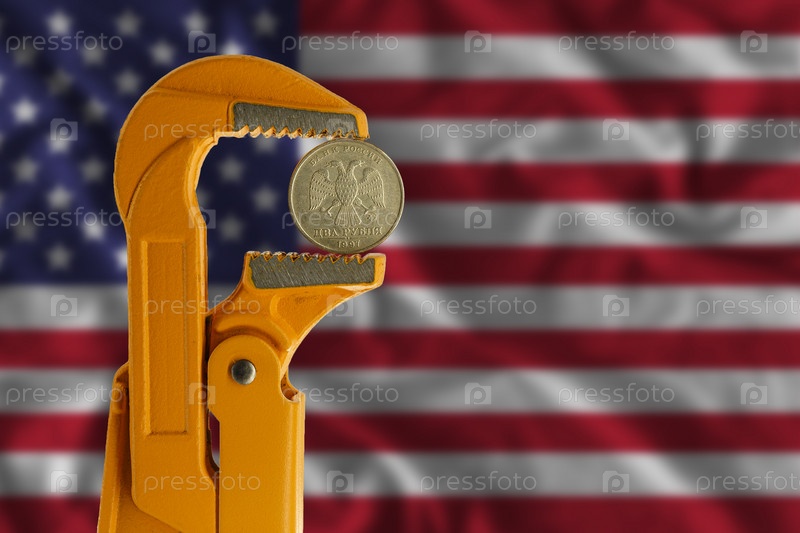 Российская монета в два рубля в оранжевом сантехническом ключе на фоне флага США. лицевая сторона медали
