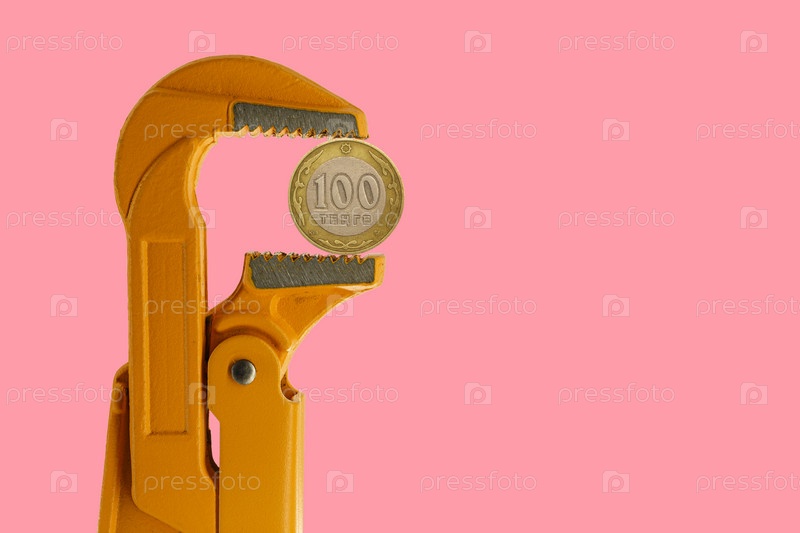 100 казахстанских тенге в оранжевом сантехническом ключе на розовом фоне. Обратная сторона медали