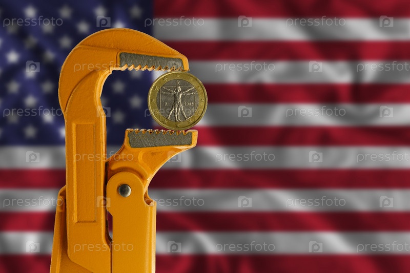 Монета в один евро в оранжевом сантехническом ключе на фоне флага США. Лицевая сторона