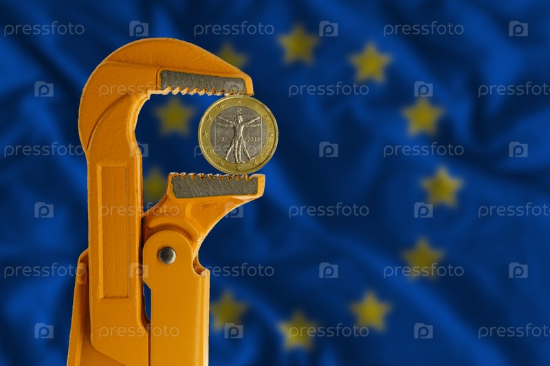 Монета в один евро в оранжевом сантехническом ключе на фоне европейского флага. Лицевая сторона