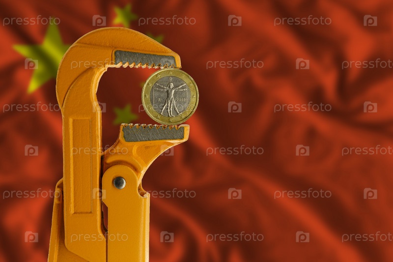 Одна монета евро зажата в оранжевом сантехническом ключе на фоне флага Китая. Лицевая сторона