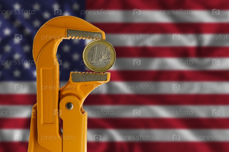 Одна монета евро зажата в оранжевом сантехническом ключе на фоне флага США. Обратная сторона