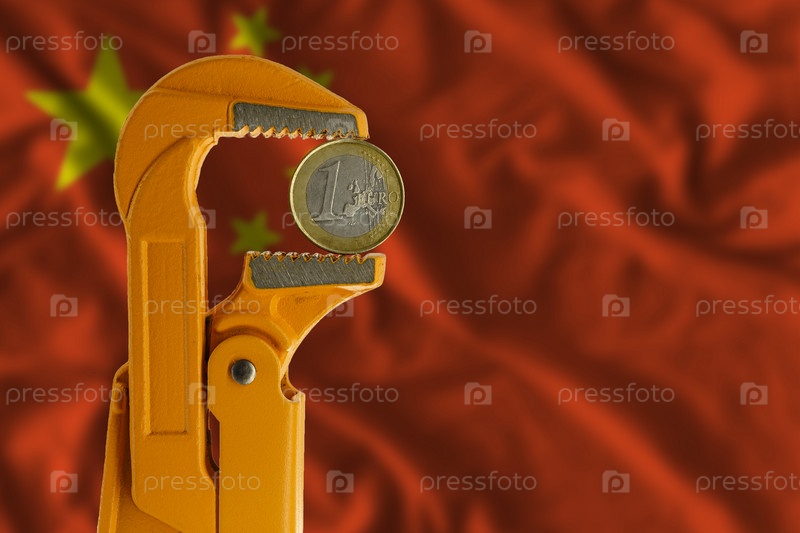 Одна монета евро зажата в оранжевом сантехническом ключе на фоне флага Китая. оборотная сторона монеты