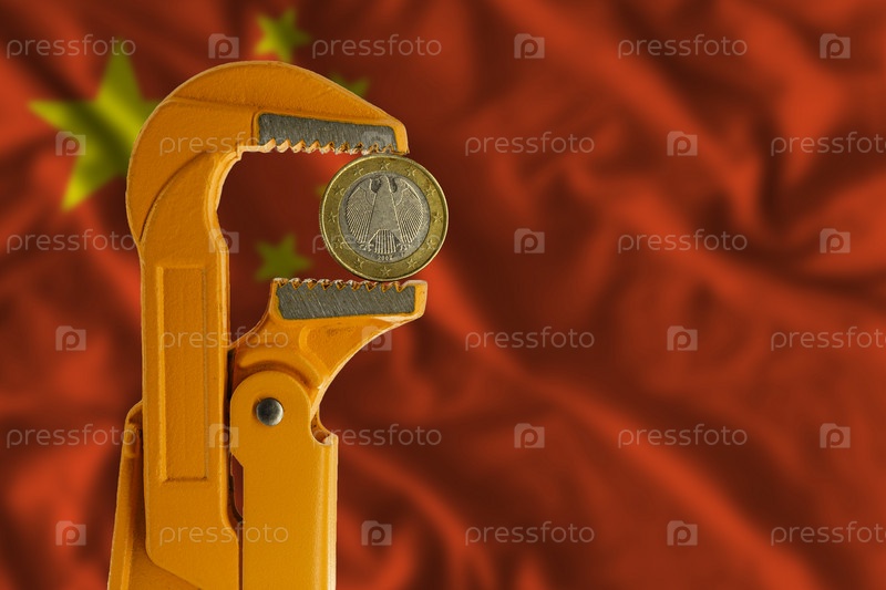 Одна монета евро зажата в оранжевом сантехническом ключе на фоне флага Китая. Аверс монеты