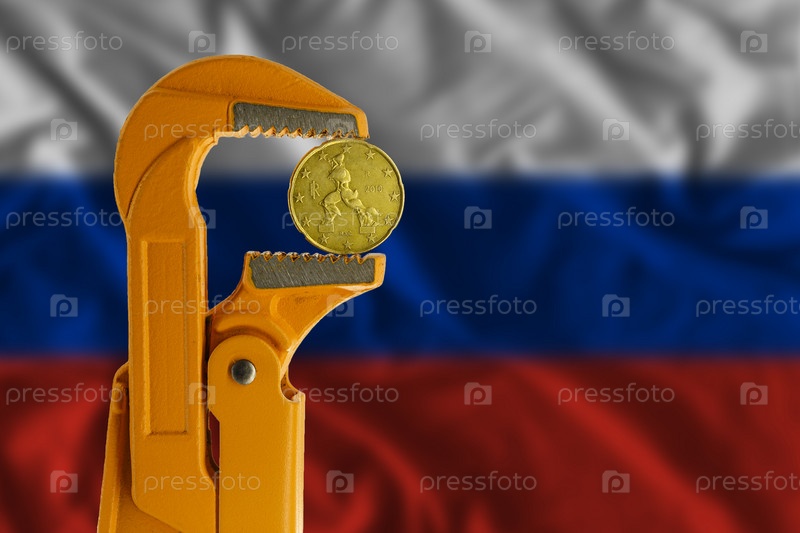 Монета номиналом 20 евроцентов зажата в оранжевом сантехническом ключе на фоне российского флага. Аверс монеты