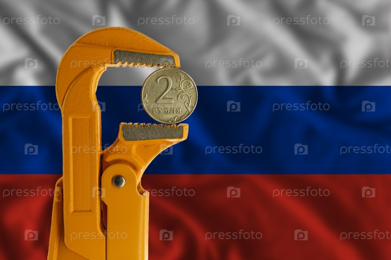 Российская монета в два рубля в оранжевом сантехническом ключе на фоне российского флага. Обратная сторона медали