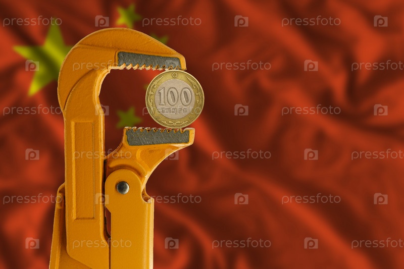 100 казахстанских тенге в оранжевом сантехническом ключе на фоне флага Китая. Обратная сторона медали