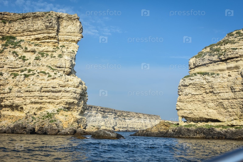 Скалистый берег Черного моря, пейзаж со скалами на берегу моря, скалы, торчащие из моря
