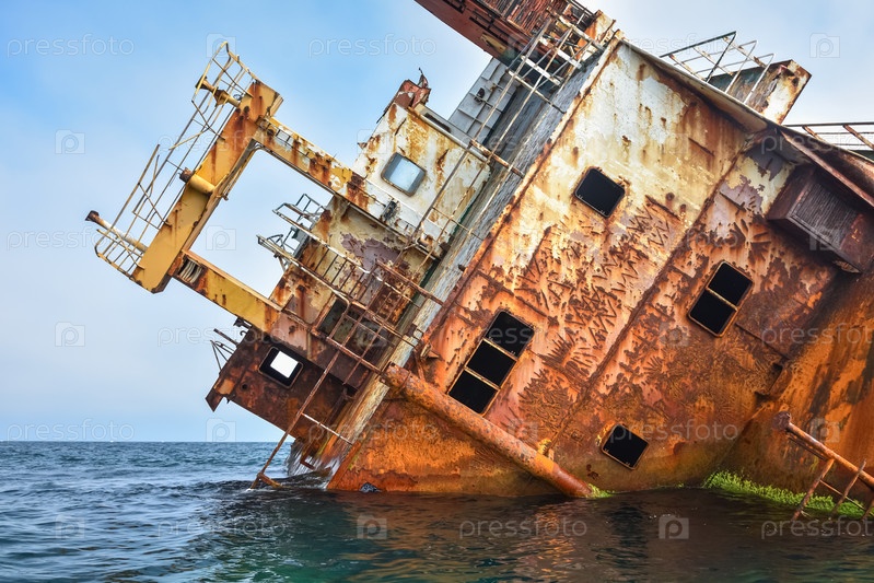 Затонувший корабль, севший на мель транспортный корабль, ржавый остов корабля