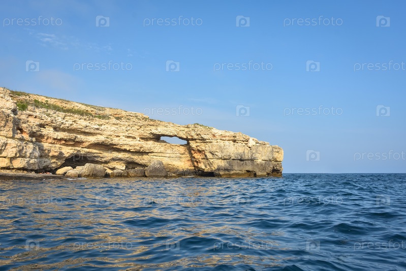 Скалистый берег Черного моря, пейзаж со скалами на берегу моря, скалы, торчащие из моря