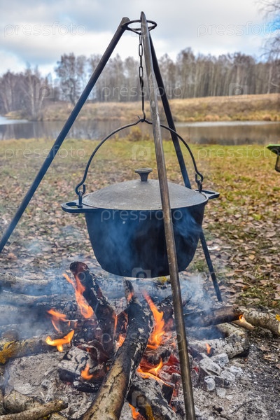Приготовление пищи в горшке на костре, приготовление пищи в лагере, горшок с горячей едой