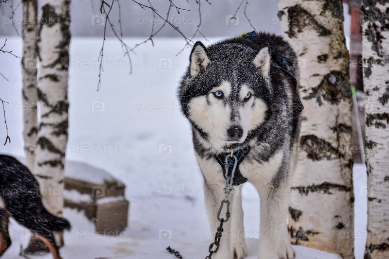 Хаски портрет, собака крупным планом зимой