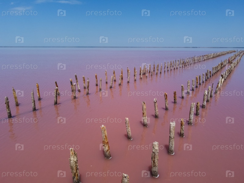 Деревянные пирсы в соленом озере, деревянные останки в розовом озере