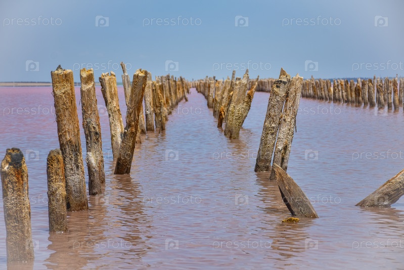 Деревянные пирсы в соленом озере, деревянные останки в розовом озере