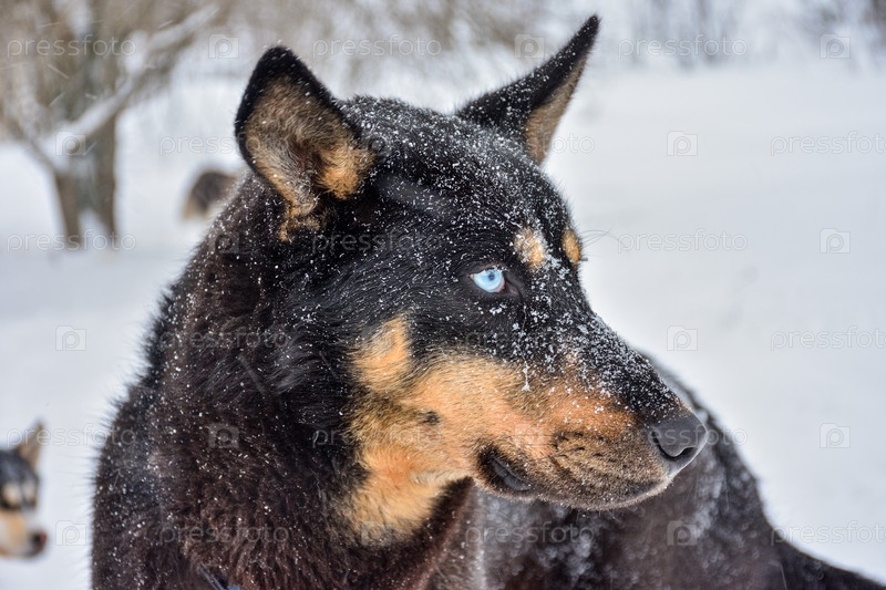 Хаски портрет, собака крупным планом зимой