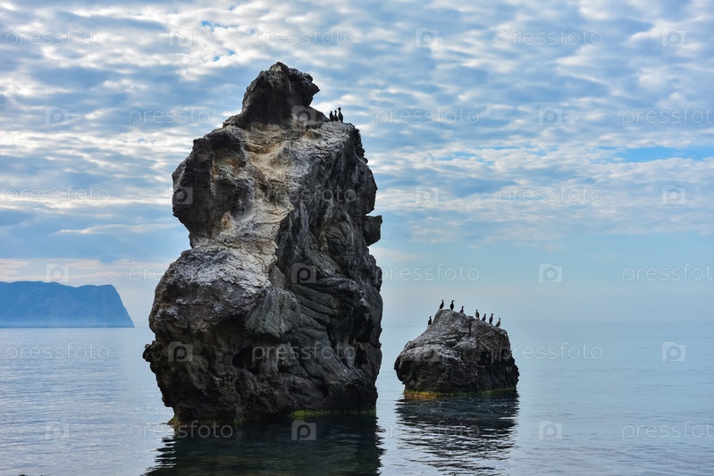 Скалистый берег Черного моря, пейзаж со скалами на берегу моря, скалы, торчащие из моря