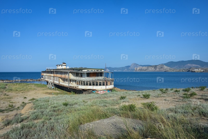 Судак, Крым, Россия - 10 июля 2021 года: заброшенный пароход, севший на мель, старый ржавый круизный пароход, скелет корабля, севший корабль