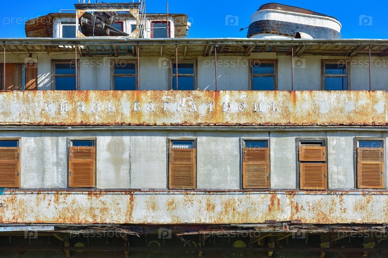 Судак, Крым, Россия - 10 июля 2021 года: заброшенный пароход, севший на мель, старый ржавый круизный пароход, скелет корабля, севший корабль