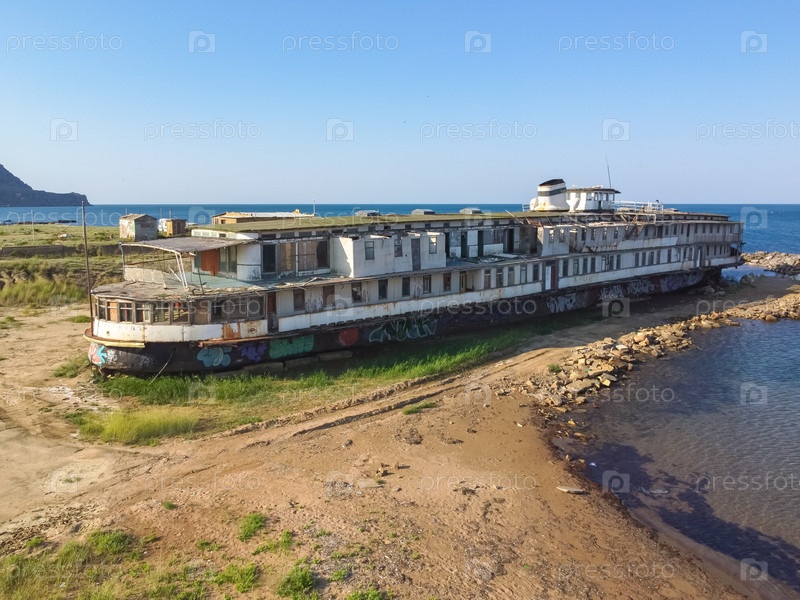 Судак, Крым, Россия - 10 июля 2021 года: заброшенный пароход, севший на мель, старый ржавый круизный пароход, остов корабля, севший на мель корабль
