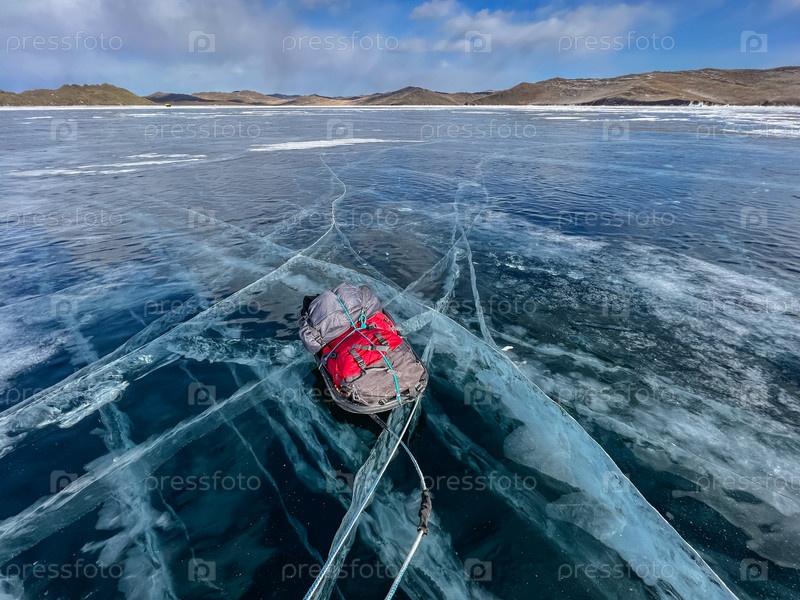 Санки волочат по замерзшему льду Байкала. Зимний поход