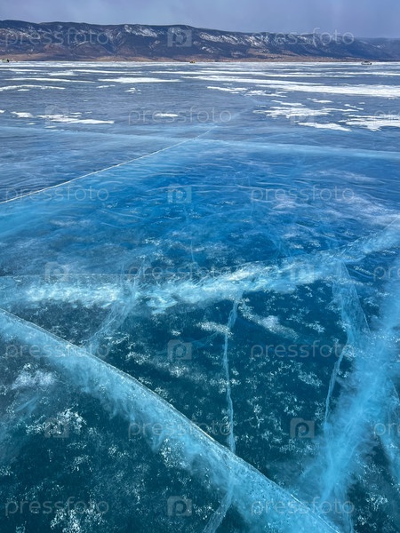 Естественная текстура зимнего льда с белыми пузырьками и трещинами на замерзшем озере. Абстрактный фон льда и трещин на поверхности замерзшего озера Байкал